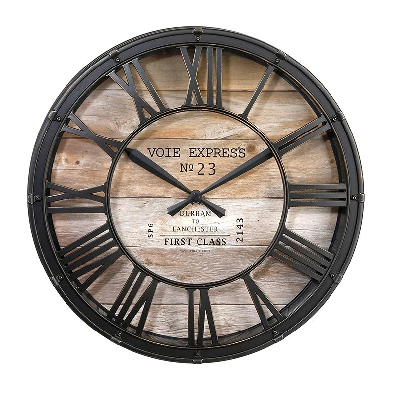 Horloge au style vintage décorée par des chiffres romains et des messages peints sur le fond.