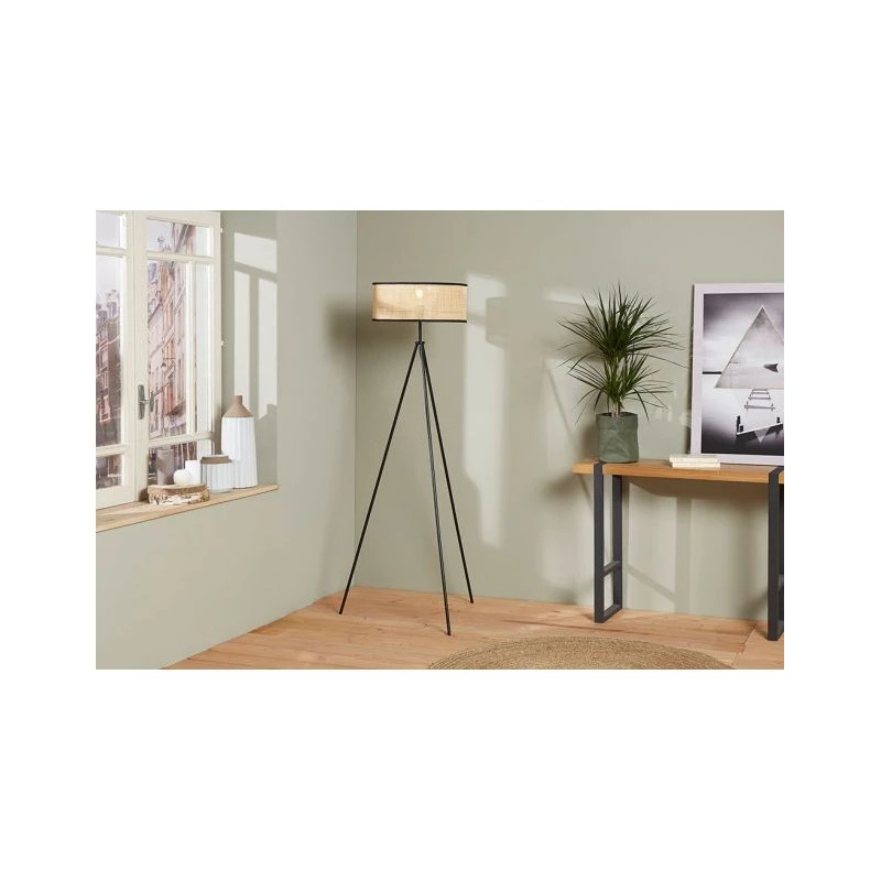 Ce lampadaire trépied métal de la marque Ostaria dispose d’un abat-jour rond en cannage.