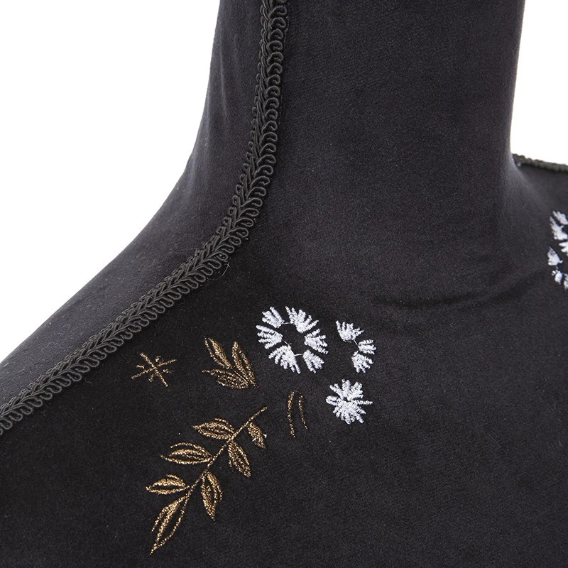 Le velours noir profond ainsi que les décorations fleuries en broderie apportent beaucoup d’élégance à ce mannequin décoratif.
