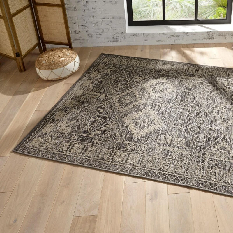 Ce grand tapis a été conçu pour convenir autant à l’intérieur qu’à l’extérieur, sur un balcon ou une terrasse par exemple.